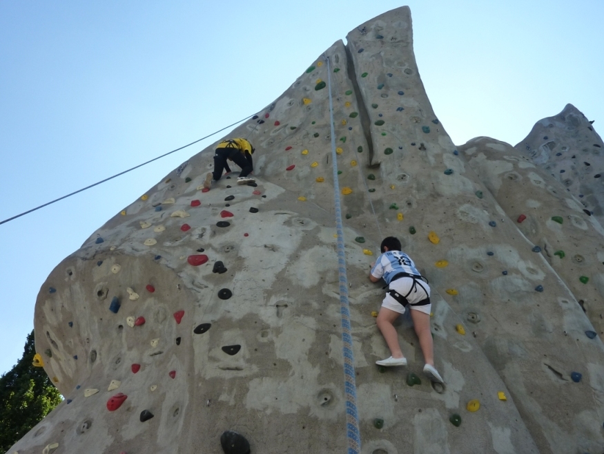 So erlebten wir einige Highlights. Neben der Gestaltung der eigenen Kletter T-Shirts, dem Erwerb und Erproben von Kletterschuhen und Sicherungsgeräten waren zwei Besuche im Hochseilgarten schon etwas Besonderes. Ganz besonders aufregend jedoch war das Klettern am echten Fels im Klettergarten Stetten, waren doch dort auf einmal keine künstlichen und farbigen Griffe, anstelle dieser jedoch so manch kleines Krabbelgetier vorzufinden.