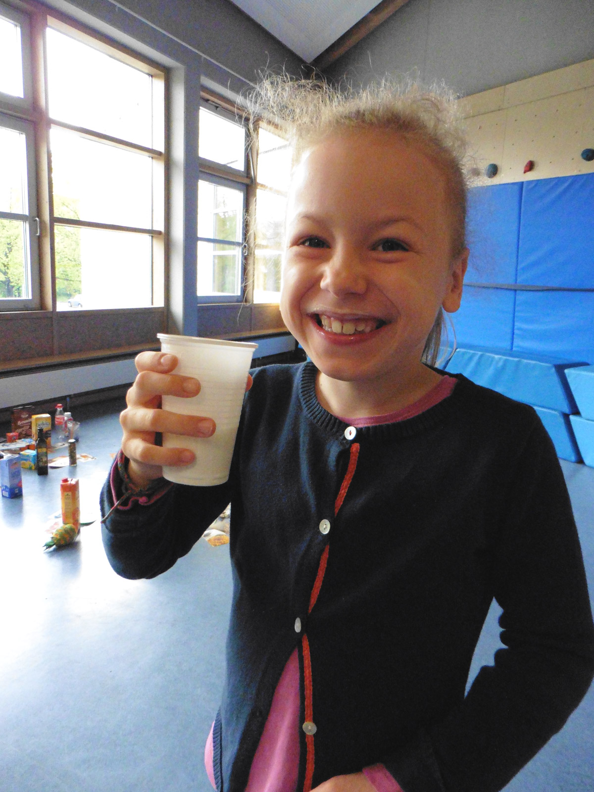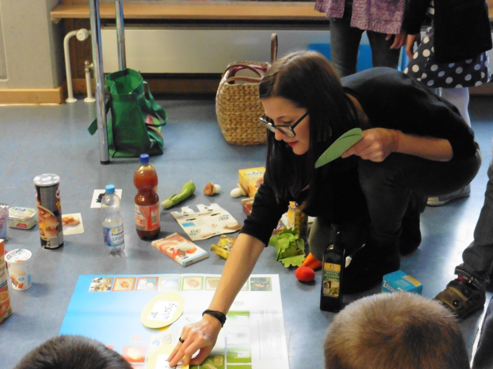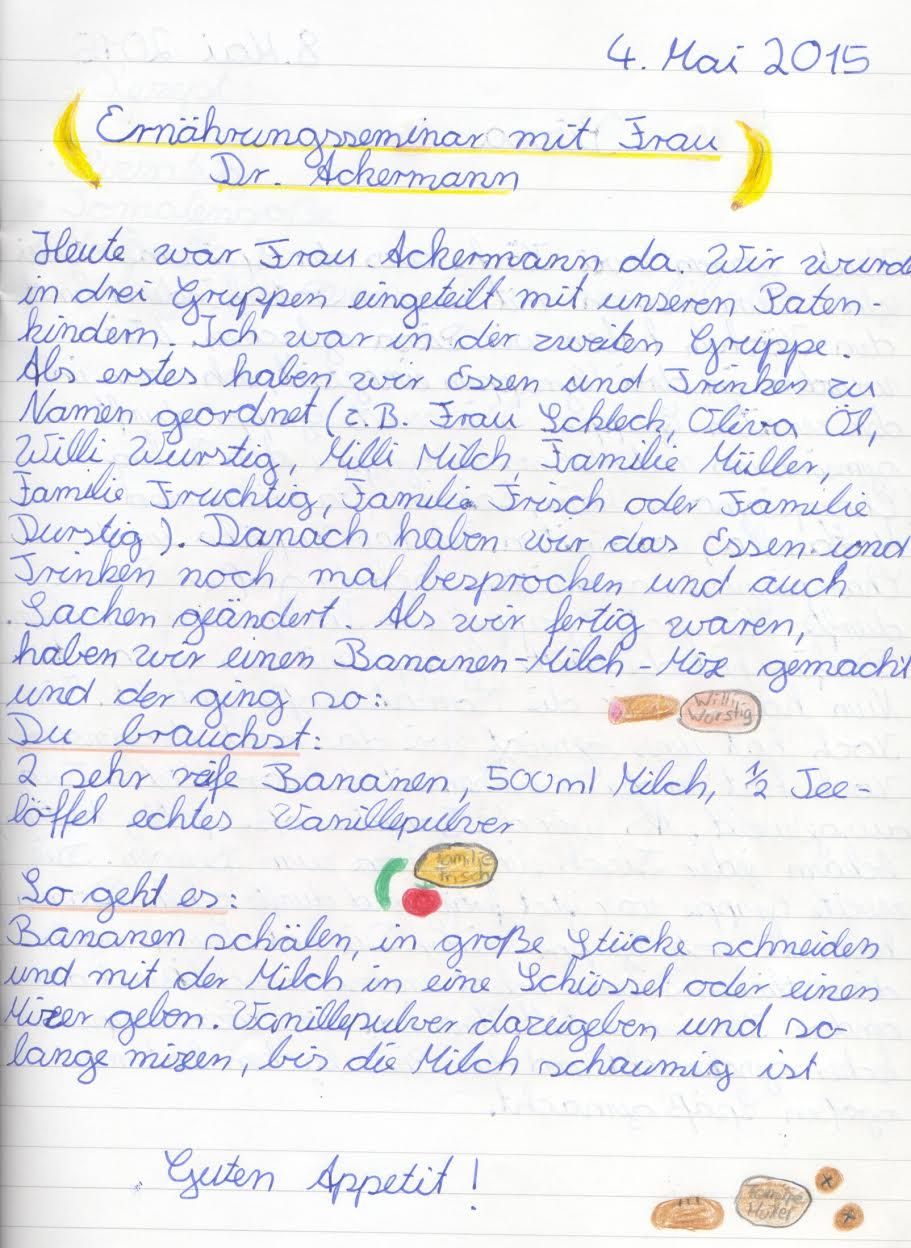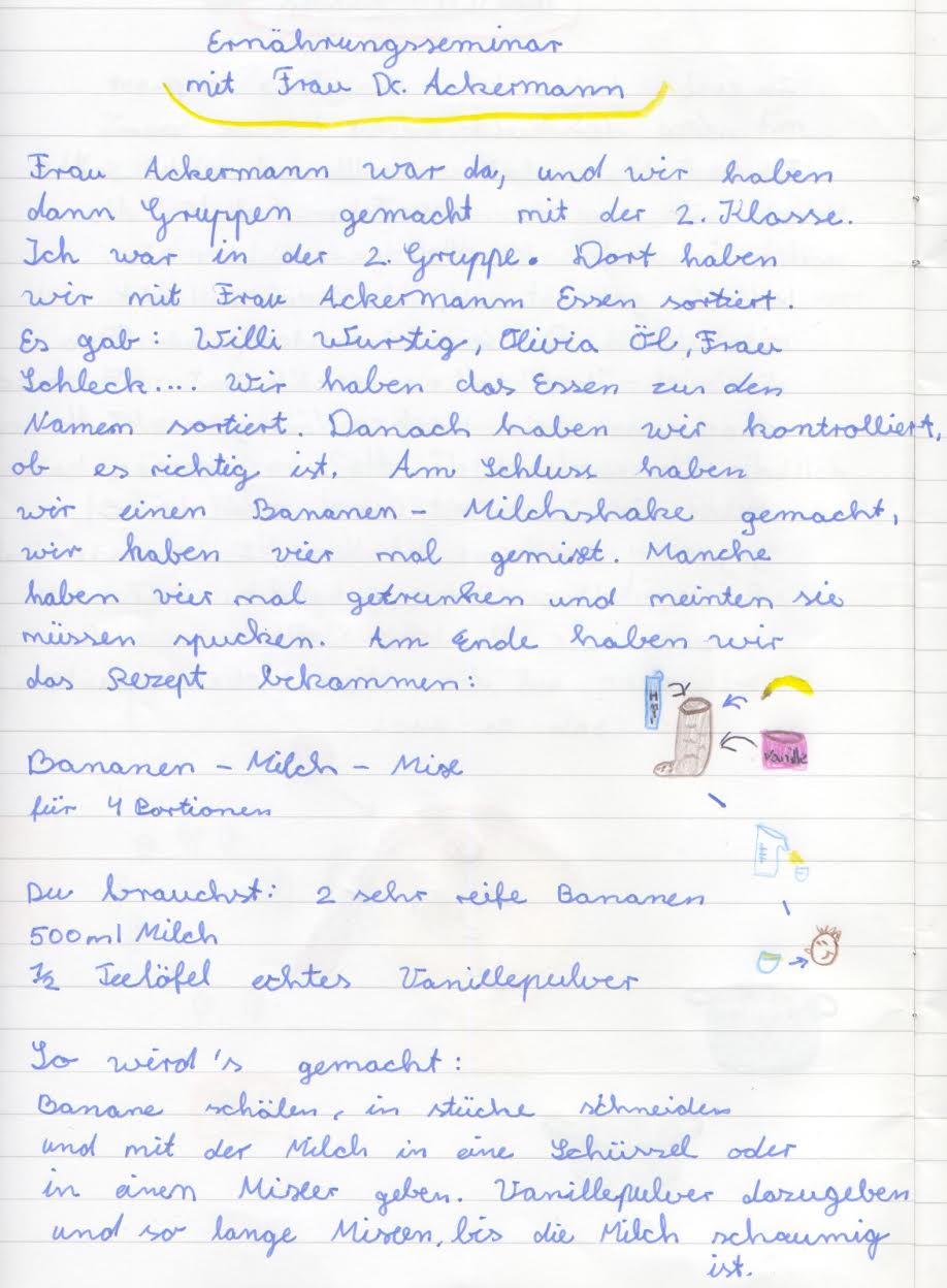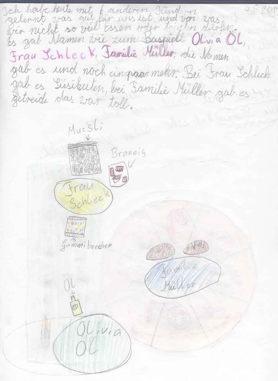 Nachdem die Eltern bereits im Herbst vergangenen Jahres einen kurzweiligen, interessanten Abend mit Frau Dr. Ackermann zum Thema “Wie viel Frucht steckt eigentlich im Zwerg?“ erleben durften, waren nun die Schülerinnen und Schüler der Klassen 2 b und 4 b an der Reihe. Stühle waren an diesem Vormittag unnötig, denn ständig waren die Kinder in Bewegung. Da galt es u.a. Lebensmittel verschiedenster Art, vom Schokoriegel über den Orangensaft bis hin zum Stück Käse, zu sortieren, zu bewerten und den verschiedenen Lebensmittelgruppen zuzuordnen. Gehört nun die fertig gekaufte Bananenmilch zur „Familie Fruchtig“ oder zu „Milli Milch“? Weder noch! Sie gehört zur „Frau Schleck“, da sie jede Menge Zucker enthält.
