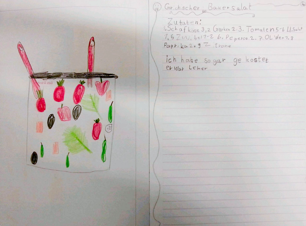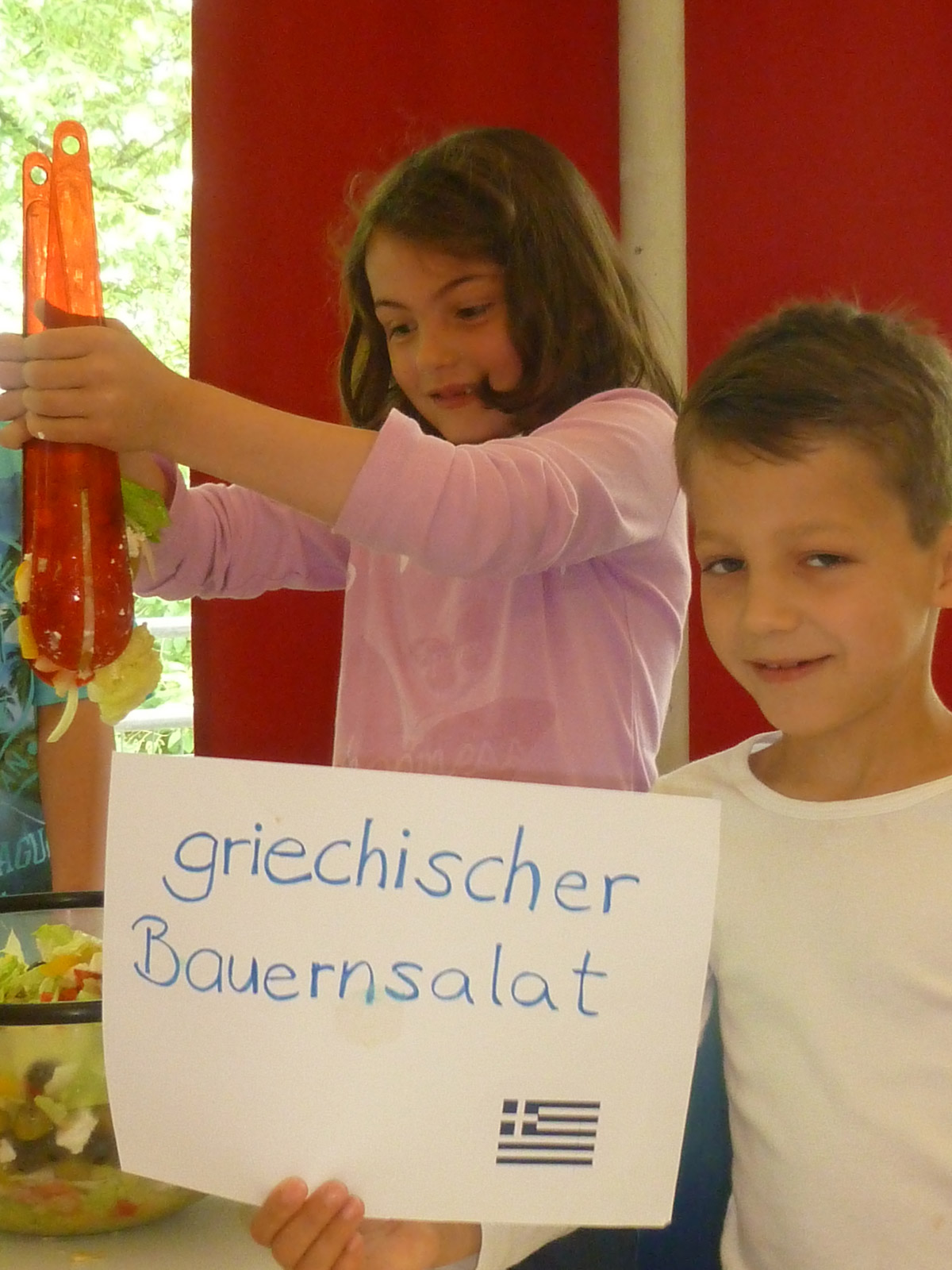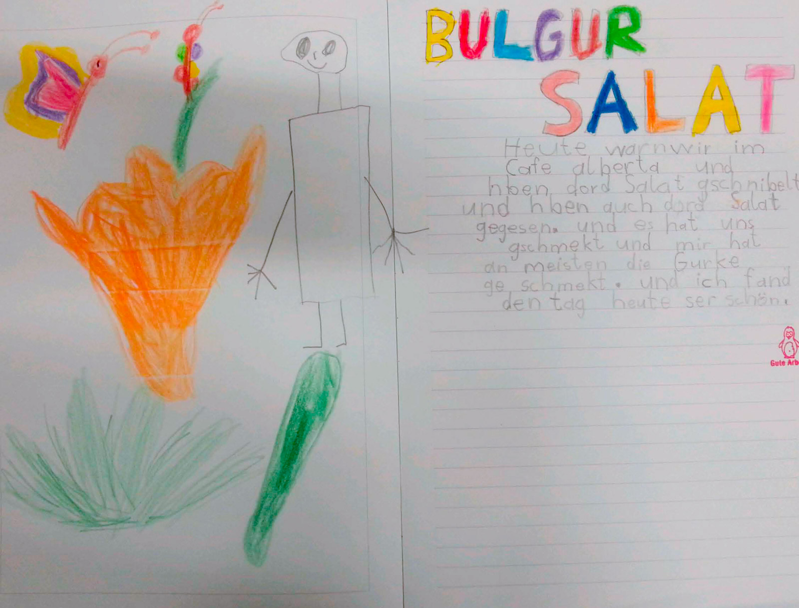 Gemeinsam mit dem Team des Schülercafé Albertas haben wir einen Salat-Tag durchgeführt. Nachdem die Kinder auf spielerische Weise verschiedene Salate kennengelernt hatten, durften sie in Kleingruppen ihre Einkaufslisten schreiben. Nach dem gemeinsamen Einkaufen begannen die Kinder fleißig zu arbeiten. Gemüse wurde gewaschen, geschnitten, gerieben und Soßen abgeschmeckt, bis alle zufrieden um den großen Tisch saßen. Zum Schluss aßen wir gemeinsam einen leckeren Karottensalat, Bulgursalat, griechischen Bauernsalat und einen Gurkensalat.