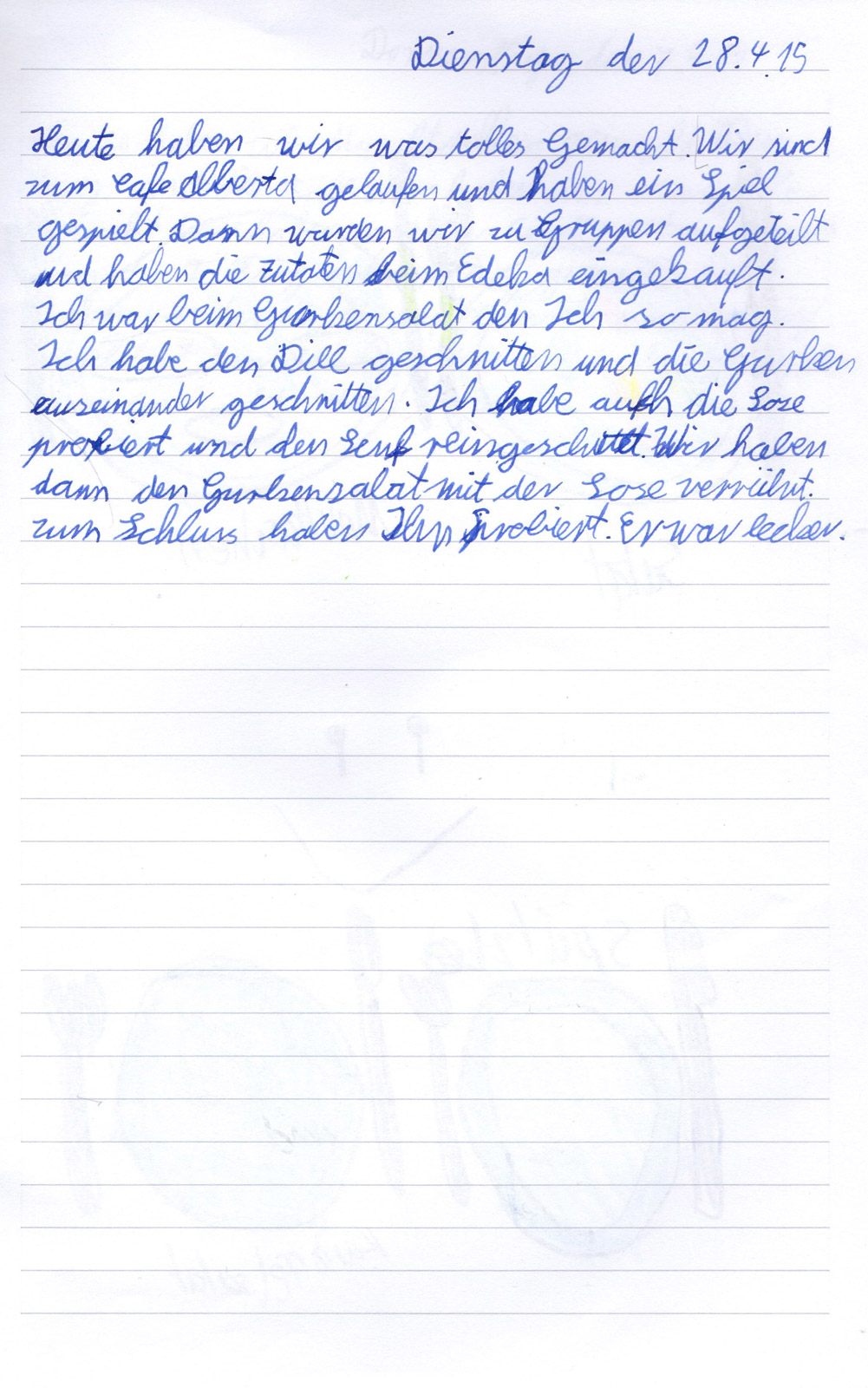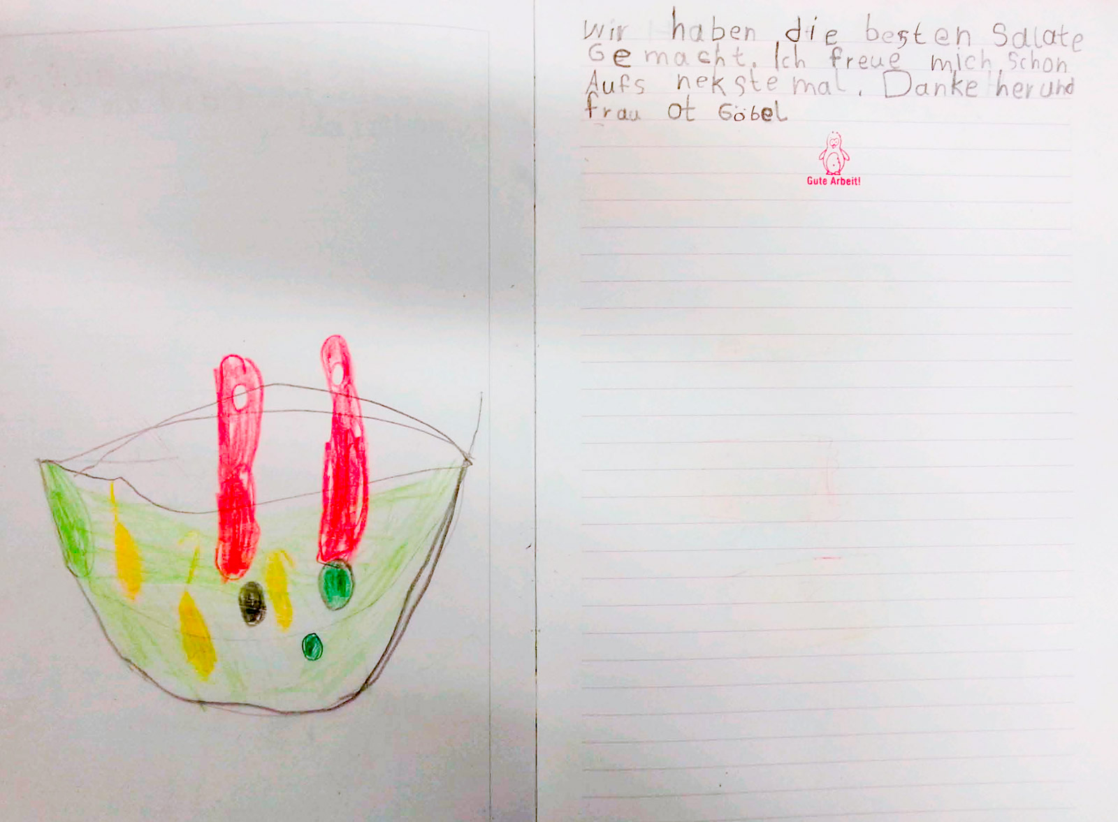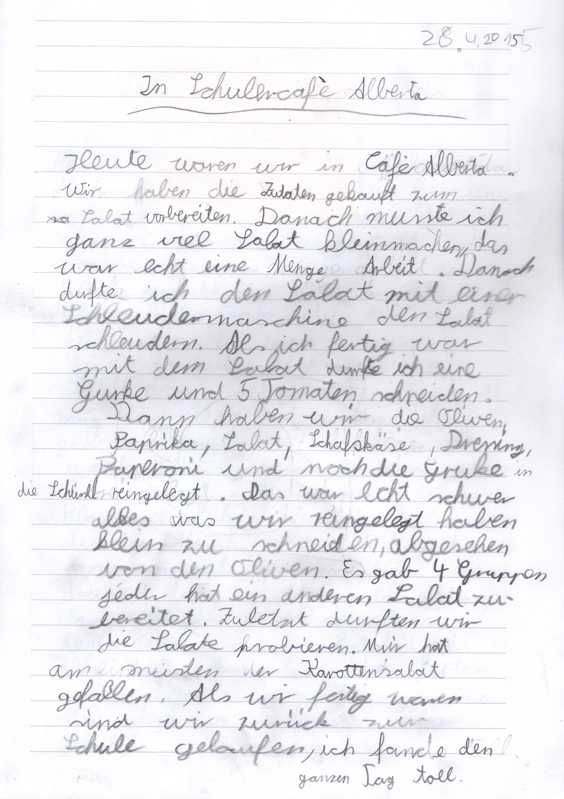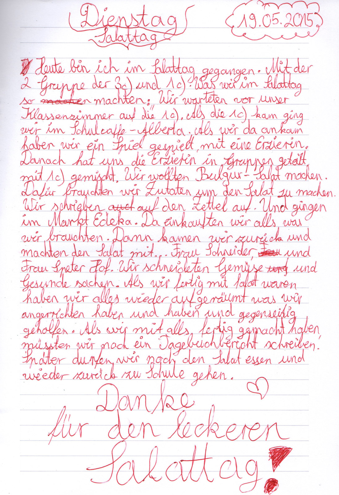 Gemeinsam mit dem Team des Schülercafé Albertas haben wir einen Salat-Tag durchgeführt. Nachdem die Kinder auf spielerische Weise verschiedene Salate kennengelernt hatten, durften sie in Kleingruppen ihre Einkaufslisten schreiben. Nach dem gemeinsamen Einkaufen begannen die Kinder fleißig zu arbeiten. Gemüse wurde gewaschen, geschnitten, gerieben und Soßen abgeschmeckt, bis alle zufrieden um den großen Tisch saßen. Zum Schluss aßen wir gemeinsam einen leckeren Karottensalat, Bulgursalat, griechischen Bauernsalat und einen Gurkensalat.