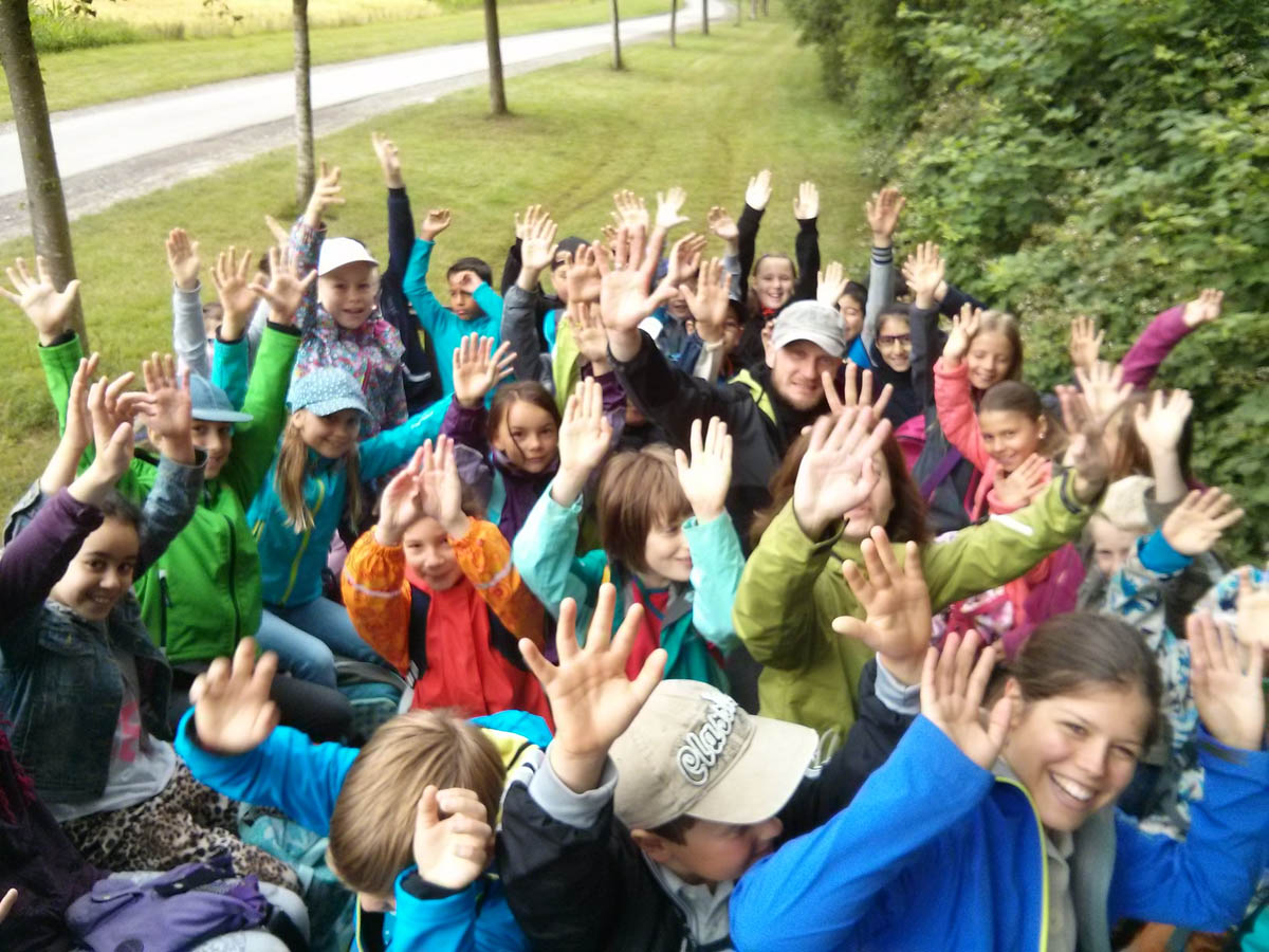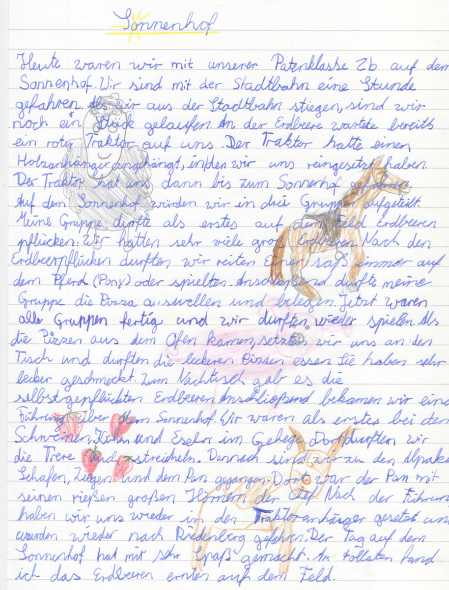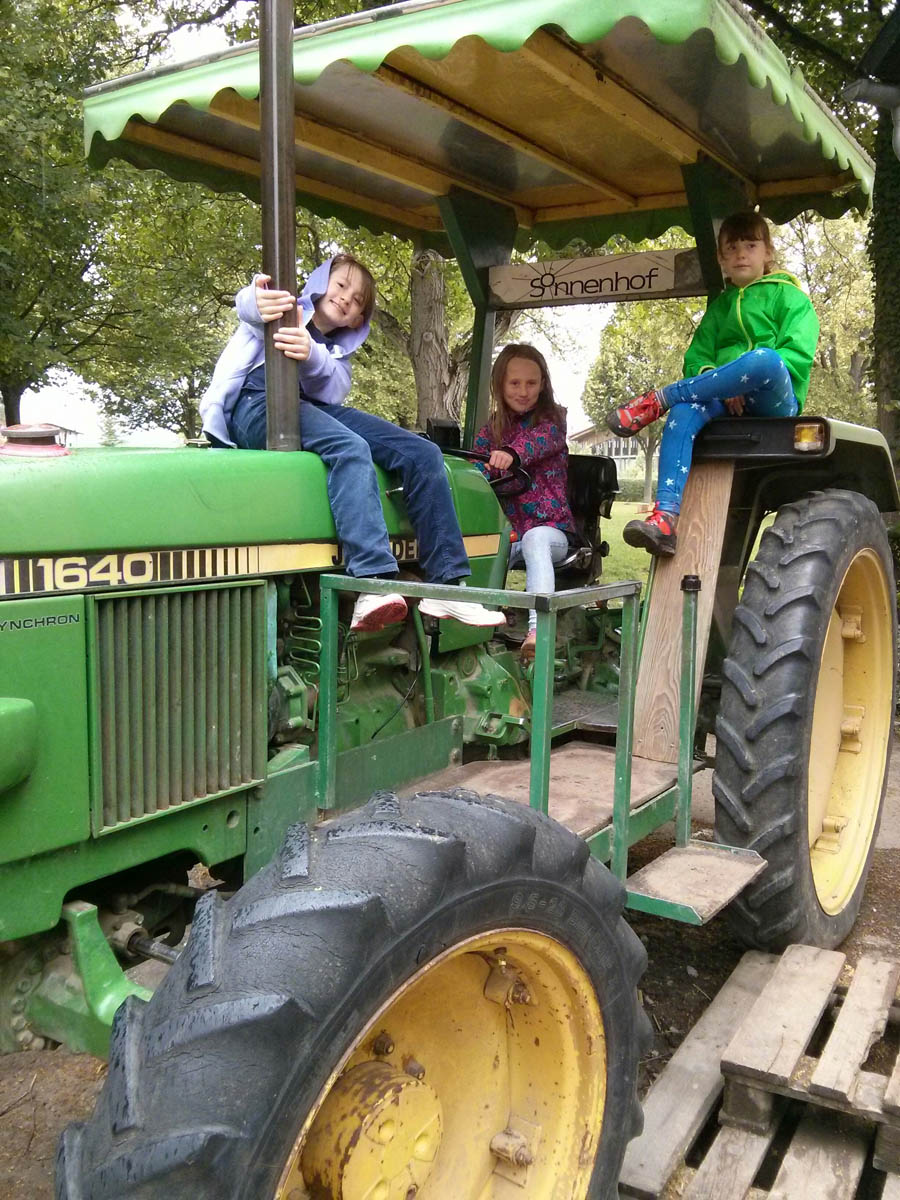 Die Vorfreude auf den Sonnenhof wuchs auf unserer Fahrt mit der Straßenbahn weiter. Von der Haltestelle wurden wir mit dem Traktor abgeholt und der Anhänger wurde von unseren aufgeregten Kindern sofort gestürmt, natürlich auf der Suche nach dem besten Platz. Auf einer Slalomfahrt durch Bäume und auch mal mitten durch eine Pfütze ging es in rasantem Tempo Richtung Sonnenhof.