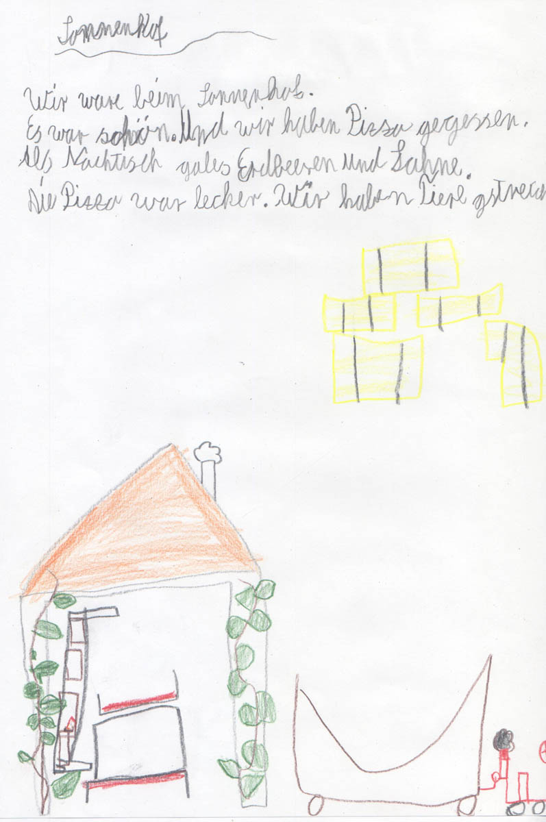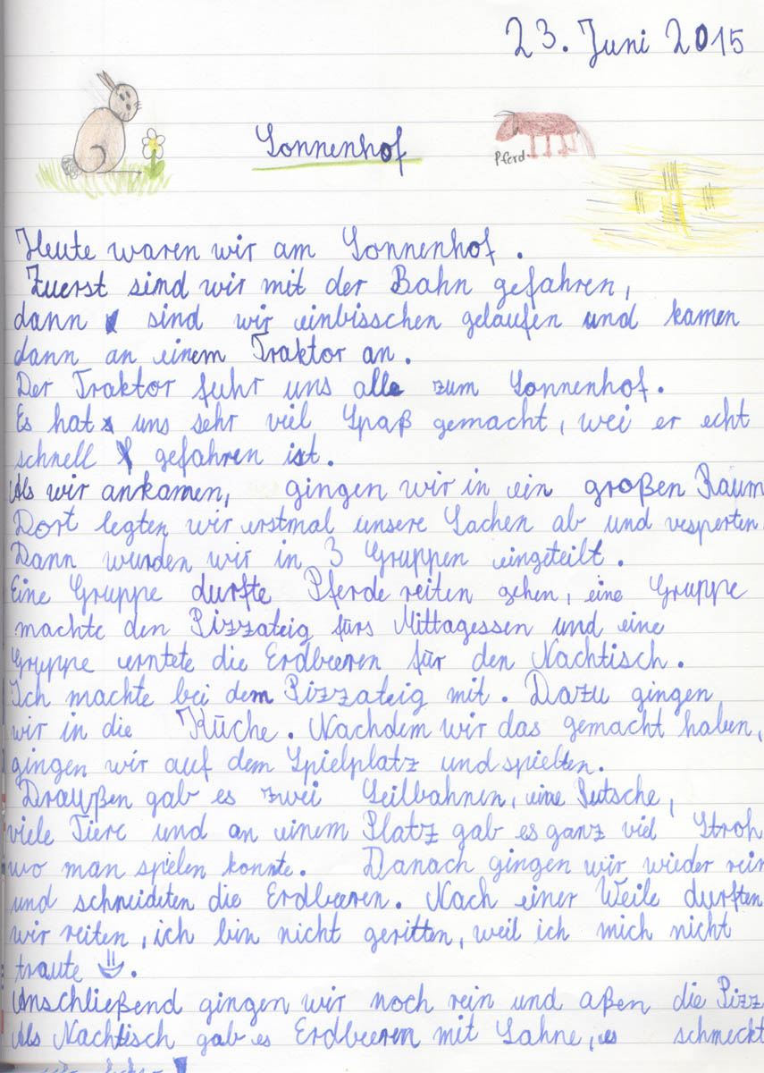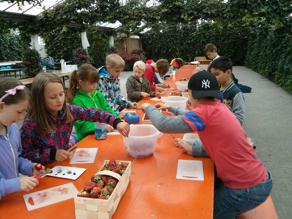 Dort wurden wir freundlich begrüßt und die Kinder in drei Gruppen eingeteilt. Eine Gruppe ging auf’s Erdbeerfeld, um den Nachtisch zu pflücken, wobei da natürlich immer wieder gleich probiert werden musste. Die andere Gruppe bereitete in der Küche den Pizzateig zu und es wurde fleißig gewogen und geknetet. Die dritte Gruppe durfte auf dem Pferdesattel über den Hof reiten. Später wurde gewechselt, bis alle Kinder geritten hatten, die Erdbeeren geschnitten und gezuckert waren und die Pizzen ausgerollt, belegt und im Ofen verstaut werden konnten.