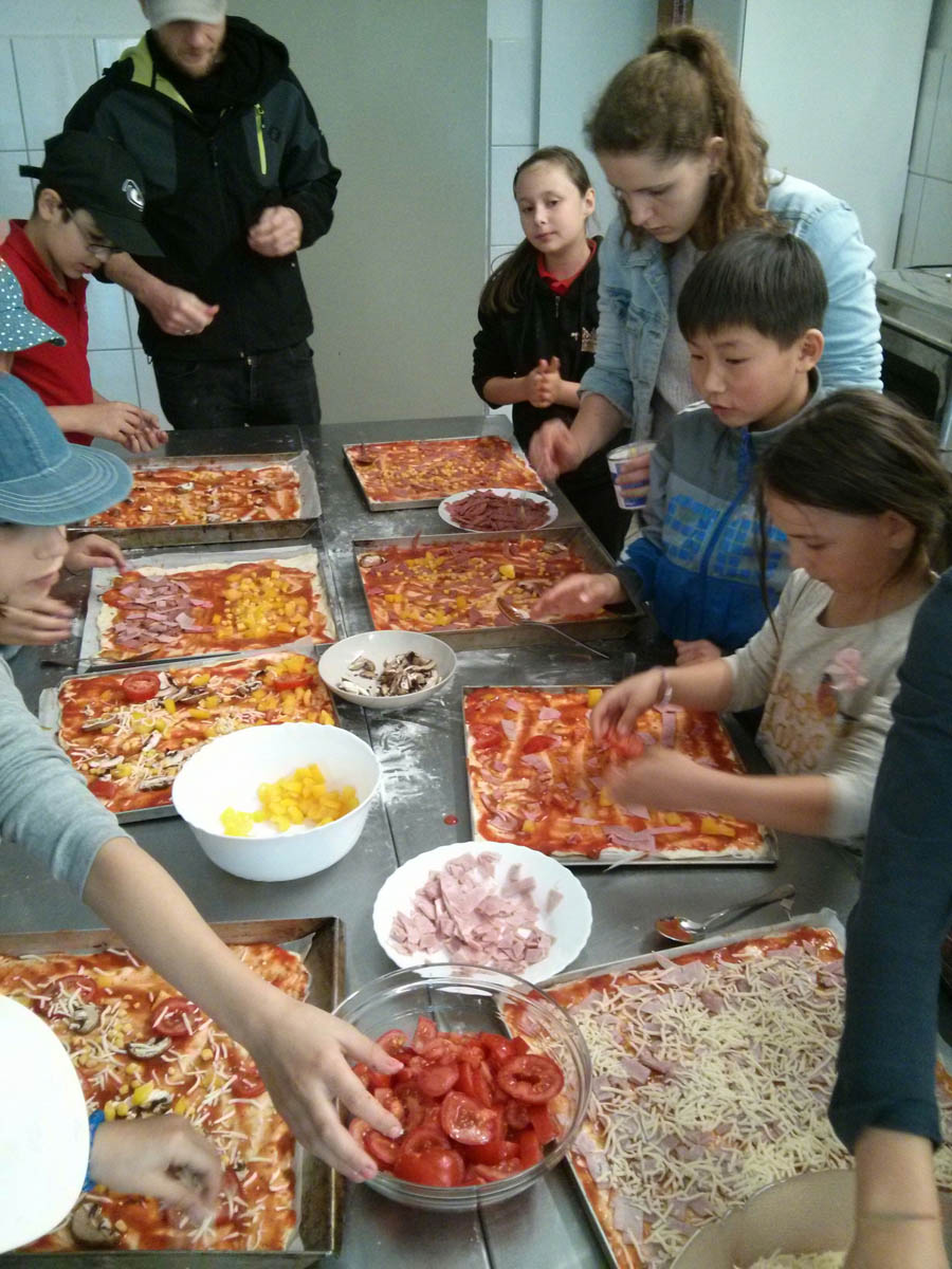 Beim Mittagessen blieb von den leckeren Pizzastücken keines mehr übrig und auch die große Erdbeerschale wurde schnell geleert – kleine Köche und Köchinnen sind eben nach getaner Arbeit ganz schön hungrig!