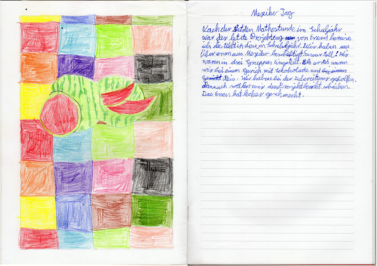 Anschließend ging es in 3 Klassenzimmern an die Arbeit. In dem ersten fand unter Anleitung von Frau Kleemann das Malen eines Stilllebens nach Frida Kahlo statt: „Melonen auf bunt kariertem Tuch“. Herr Delgado bereitete mit einer Gruppe von 15 Schülern eine fleischhaltige und vegetarische Füllung für die Tortillas zu. Frau Scheerer kochte zusammen mit den Kindern Reis und Mole, eine herzhafte Schokoladensoße mit Bananen und Hühnchenfleisch. Außerdem stellten die Schüler noch eine Guacamole her. Nach einer halben Stunde wechselten die Kinder das Klassenzimmer. Um 11 Uhr versammelten sich alle Lehrerinnen und Schüler auf dem Pausenhof, um dort gemeinsam die selbstgekochten mexikanischen Gerichte zu essen. Den meisten Kindern schmeckte das Essen sehr gut und sie konnten von den Tortillas gar nicht genug bekommen. Der krönende Abschluss des Mexiko-Tages war das Schlagen von 2 Pinatas und das anschließende Aufsammeln der vielen Süßigkeiten.
