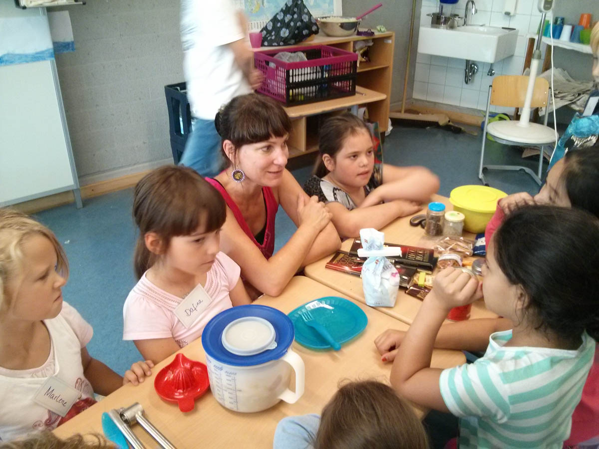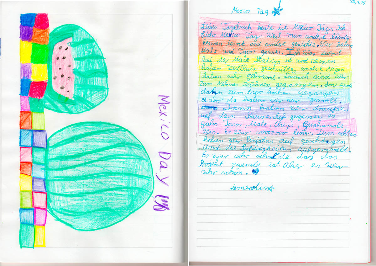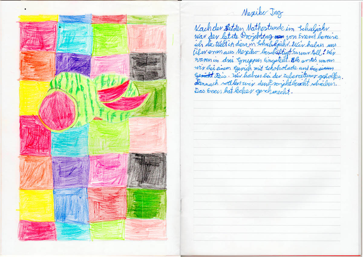 Am zweitletzten Schultag in diesem Schuljahr durften wir zusammen mit den Eltern von Anneki, Herrn Delgado und Frau Scheerer, „essend in das Land Mexiko reisen“. Dazu versammelten sich beide Projektklassen in einem Klassenzimmer und Herr Delgado erzählte uns dort über sein Land, die Menschen und ihre Essgewohnheiten. Die Schüler haben vieles über die Kakaobohne gelernt und dass Schokolade ursprünglich eigentlich gar nicht süß schmeckte. Außerdem gab es beeindruckende Fotos von der Kaugummigewinnung und -herstellung in Mexiko zu sehen. Anschließend wurde den Kindern durch eine kleine Fotopräsentation von Herrn Delgado, untermalt von fröhlichen mexikanischen Klängen, eindrücklich das Leben in Mexiko näher gebracht. Die Kinder waren total begeistert von den farbenfrohen Bildern und sie wollten die Fotos unbedingt gleich noch einmal sehen.