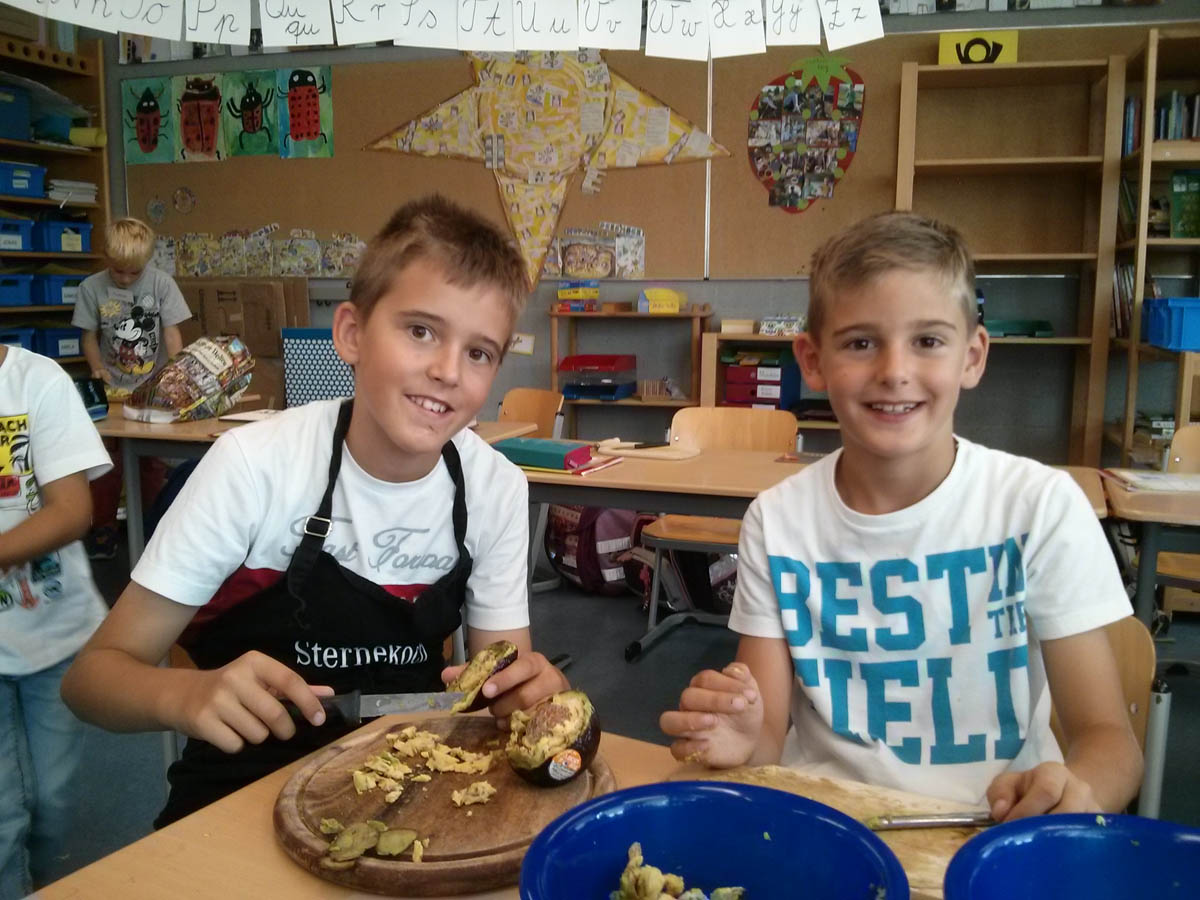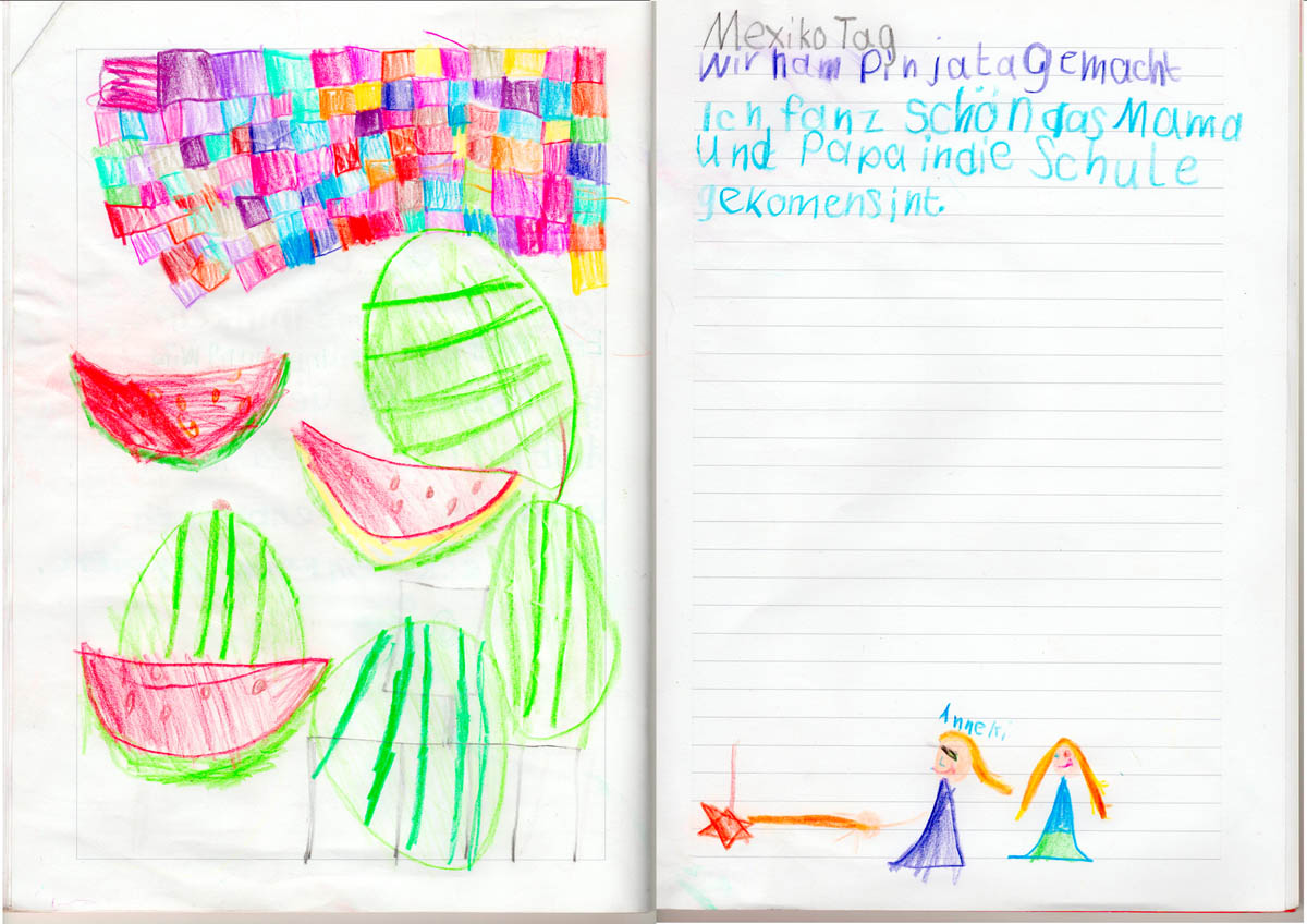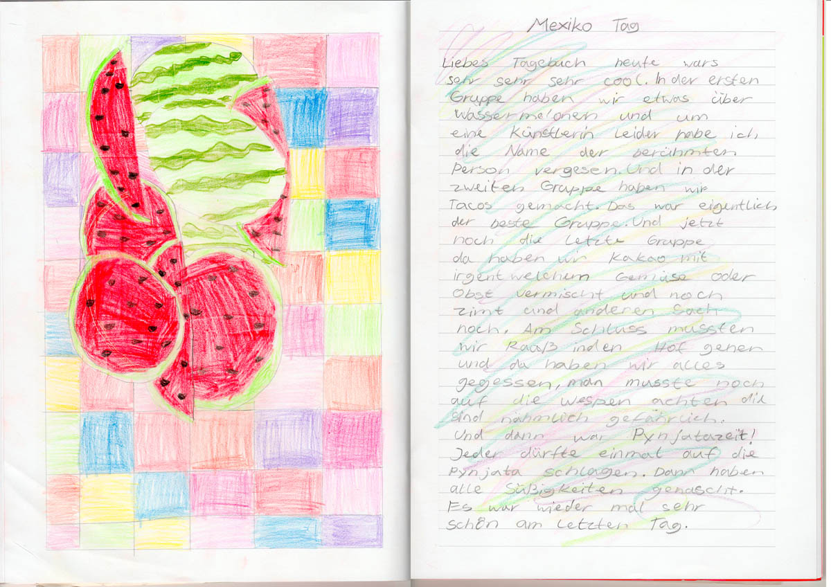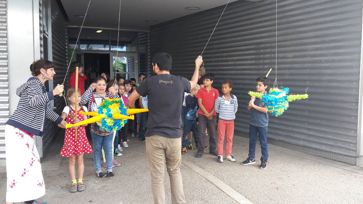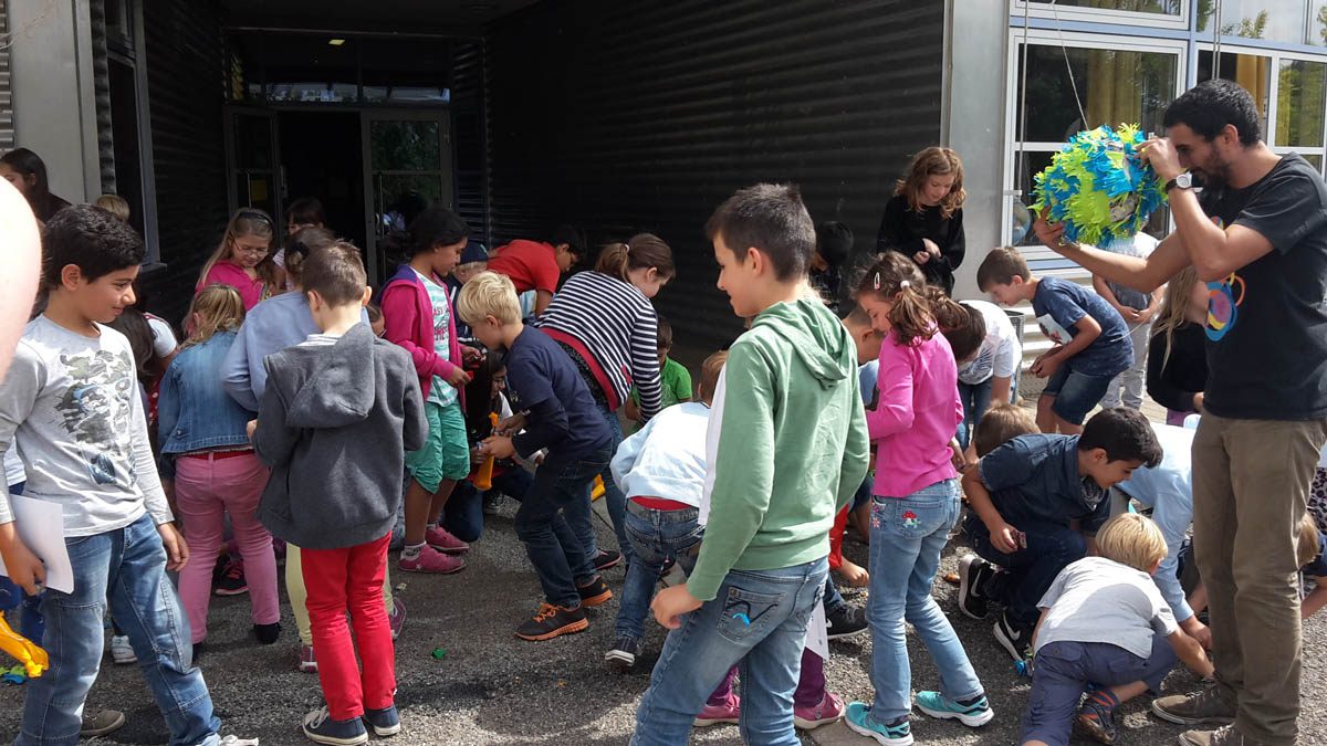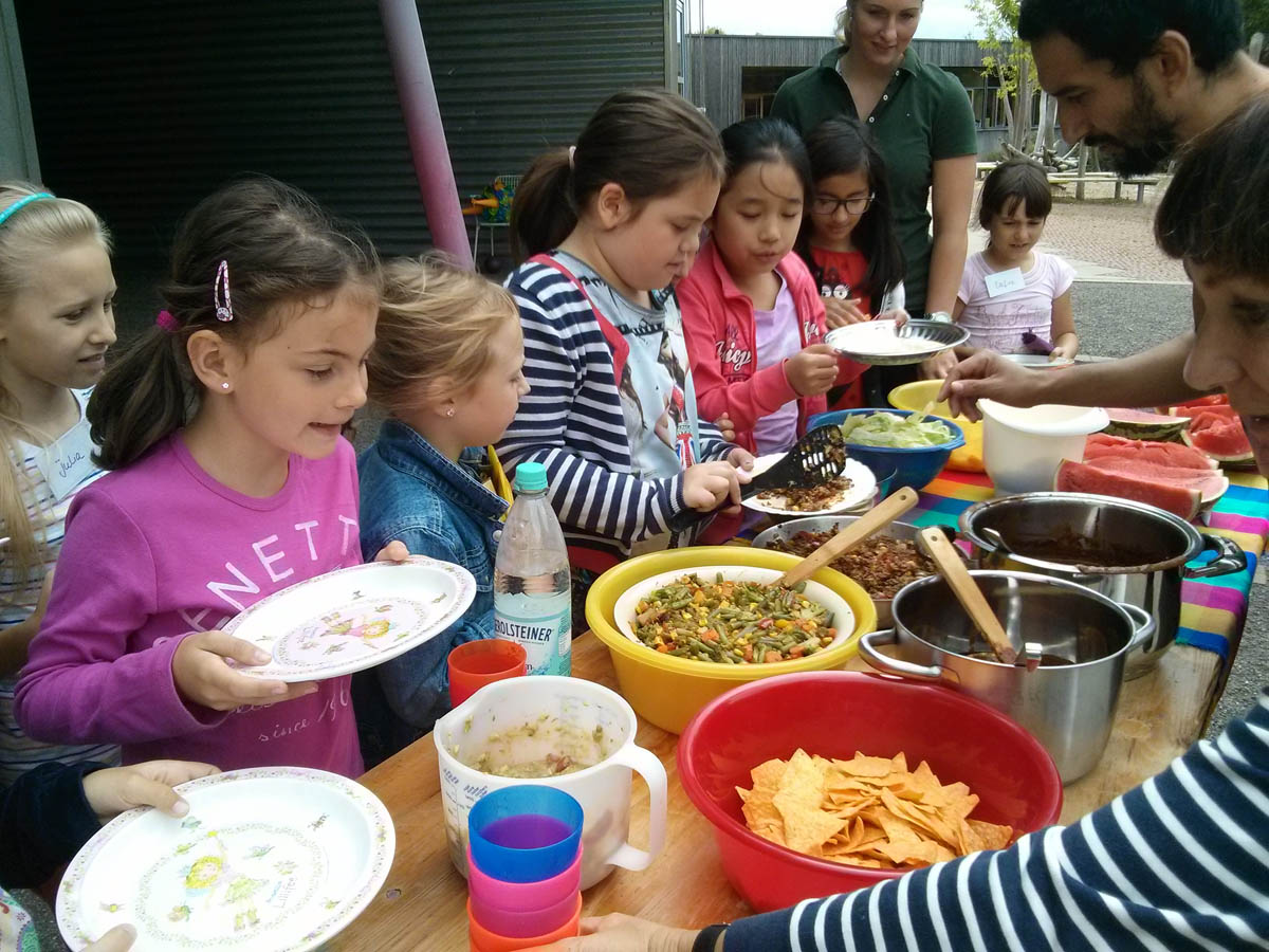 Anschließend ging es in 3 Klassenzimmern an die Arbeit. In dem ersten fand unter Anleitung von Frau Kleemann das Malen eines Stilllebens nach Frida Kahlo statt: „Melonen auf bunt kariertem Tuch“. Herr Delgado bereitete mit einer Gruppe von 15 Schülern eine fleischhaltige und vegetarische Füllung für die Tortillas zu. Frau Scheerer kochte zusammen mit den Kindern Reis und Mole, eine herzhafte Schokoladensoße mit Bananen und Hühnchenfleisch. Außerdem stellten die Schüler noch eine Guacamole her. Nach einer halben Stunde wechselten die Kinder das Klassenzimmer. Um 11 Uhr versammelten sich alle Lehrerinnen und Schüler auf dem Pausenhof, um dort gemeinsam die selbstgekochten mexikanischen Gerichte zu essen. Den meisten Kindern schmeckte das Essen sehr gut und sie konnten von den Tortillas gar nicht genug bekommen. Der krönende Abschluss des Mexiko-Tages war das Schlagen von 2 Pinatas und das anschließende Aufsammeln der vielen Süßigkeiten.