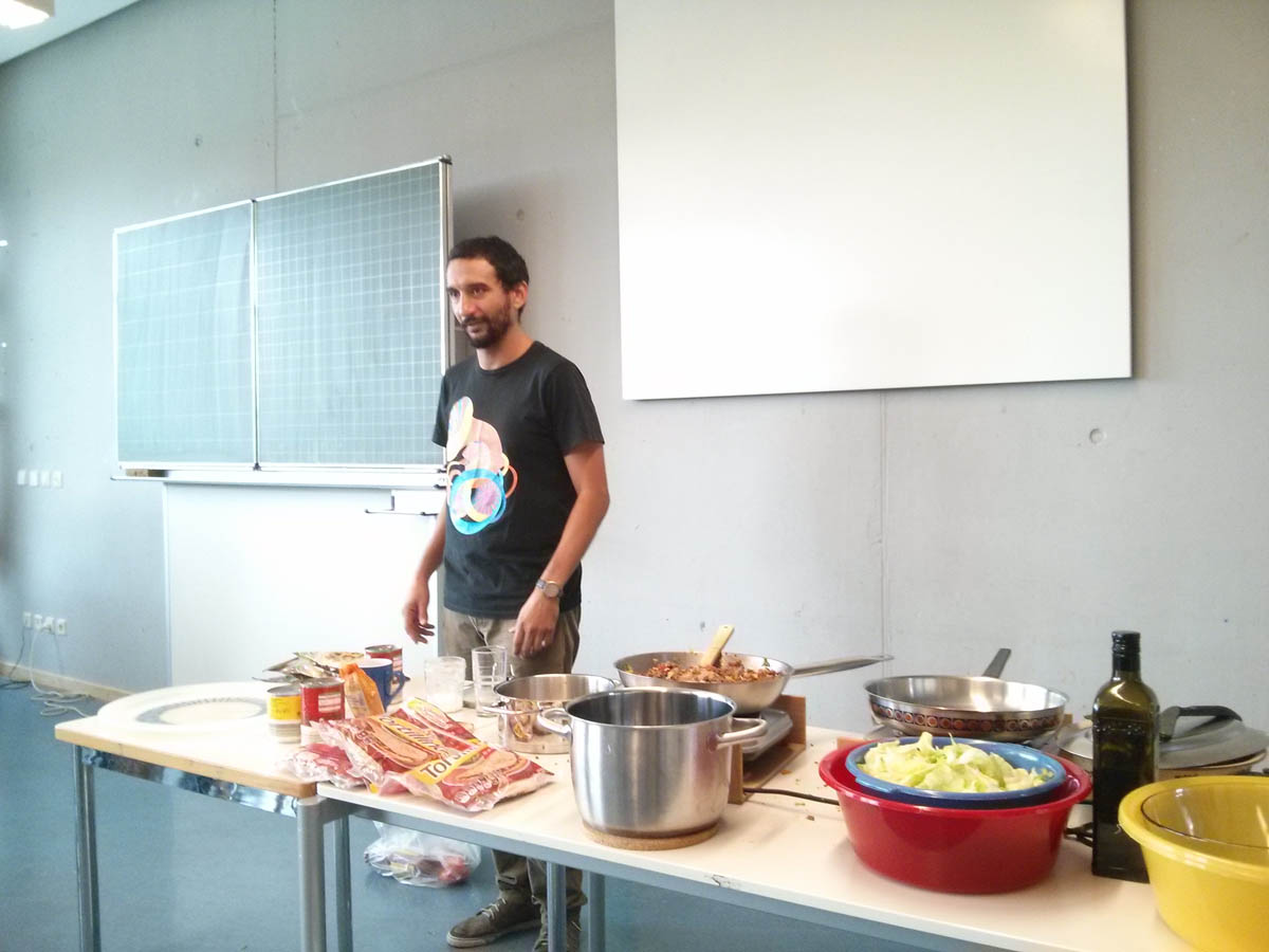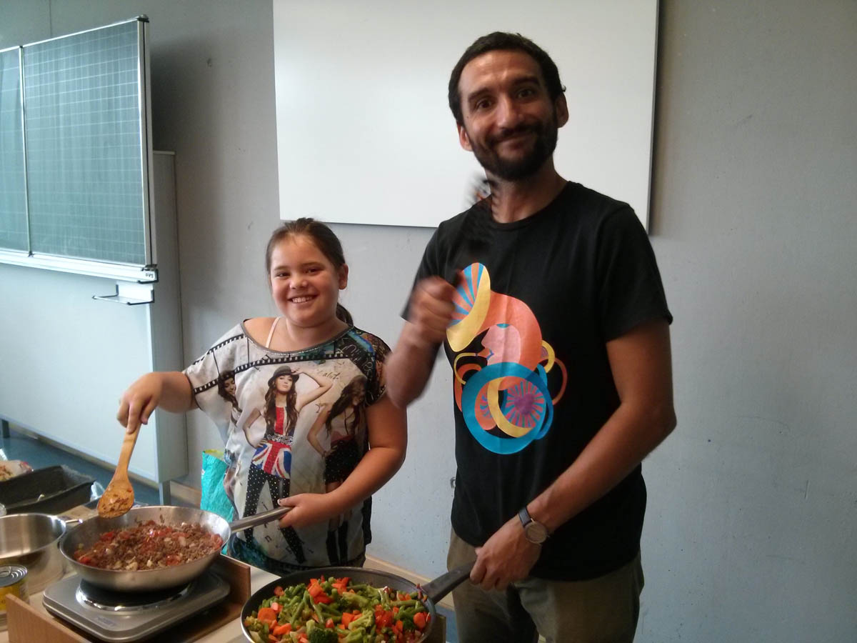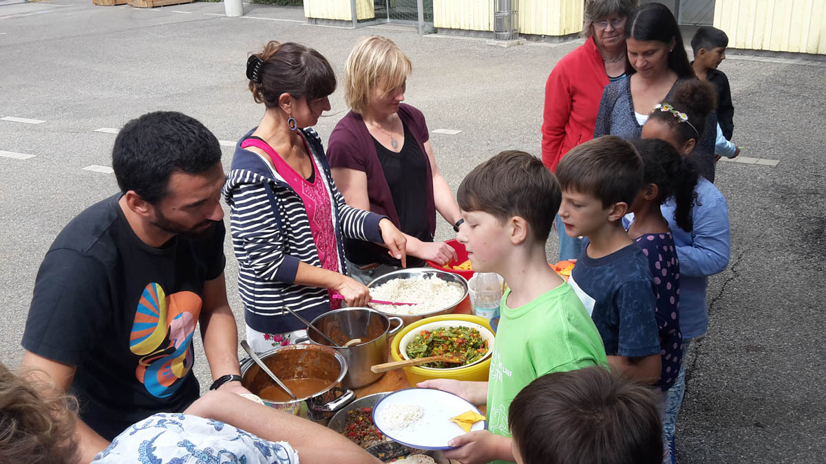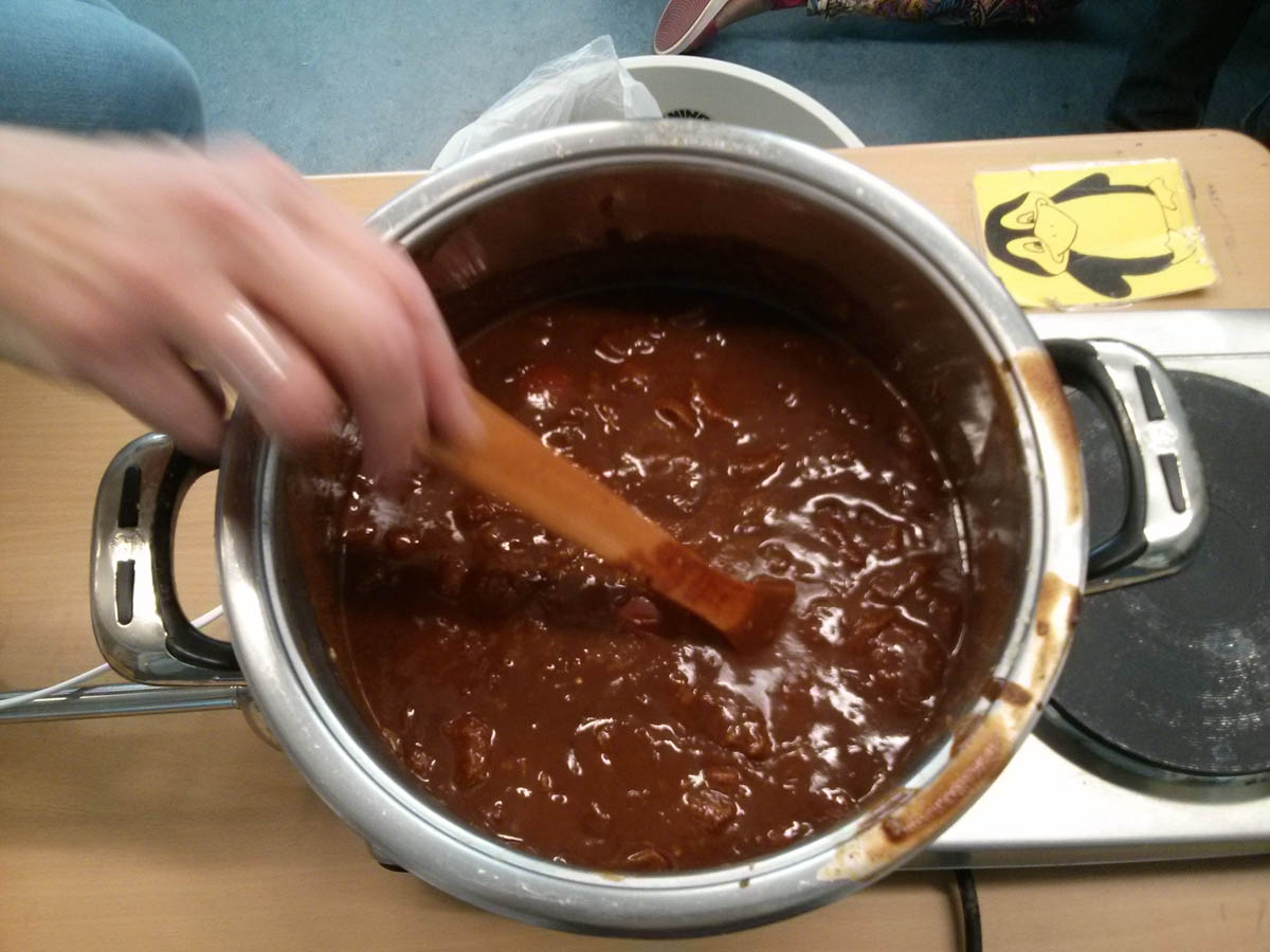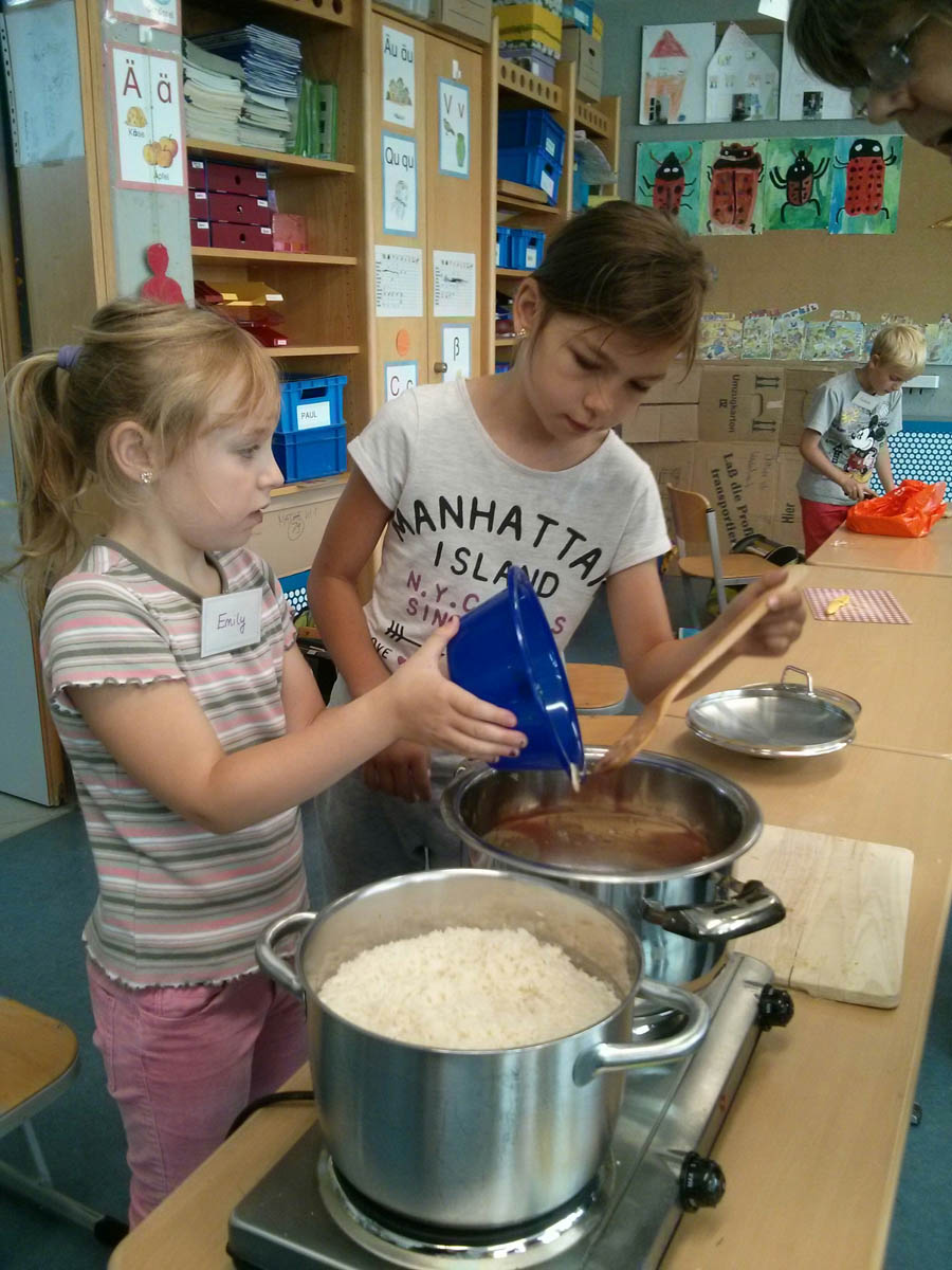 Anschließend ging es in 3 Klassenzimmern an die Arbeit. In dem ersten fand unter Anleitung von Frau Kleemann das Malen eines Stilllebens nach Frida Kahlo statt: „Melonen auf bunt kariertem Tuch“. Herr Delgado bereitete mit einer Gruppe von 15 Schülern eine fleischhaltige und vegetarische Füllung für die Tortillas zu. Frau Scheerer kochte zusammen mit den Kindern Reis und Mole, eine herzhafte Schokoladensoße mit Bananen und Hühnchenfleisch. Außerdem stellten die Schüler noch eine Guacamole her. Nach einer halben Stunde wechselten die Kinder das Klassenzimmer. Um 11 Uhr versammelten sich alle Lehrerinnen und Schüler auf dem Pausenhof, um dort gemeinsam die selbstgekochten mexikanischen Gerichte zu essen. Den meisten Kindern schmeckte das Essen sehr gut und sie konnten von den Tortillas gar nicht genug bekommen. Der krönende Abschluss des Mexiko-Tages war das Schlagen von 2 Pinatas und das anschließende Aufsammeln der vielen Süßigkeiten.