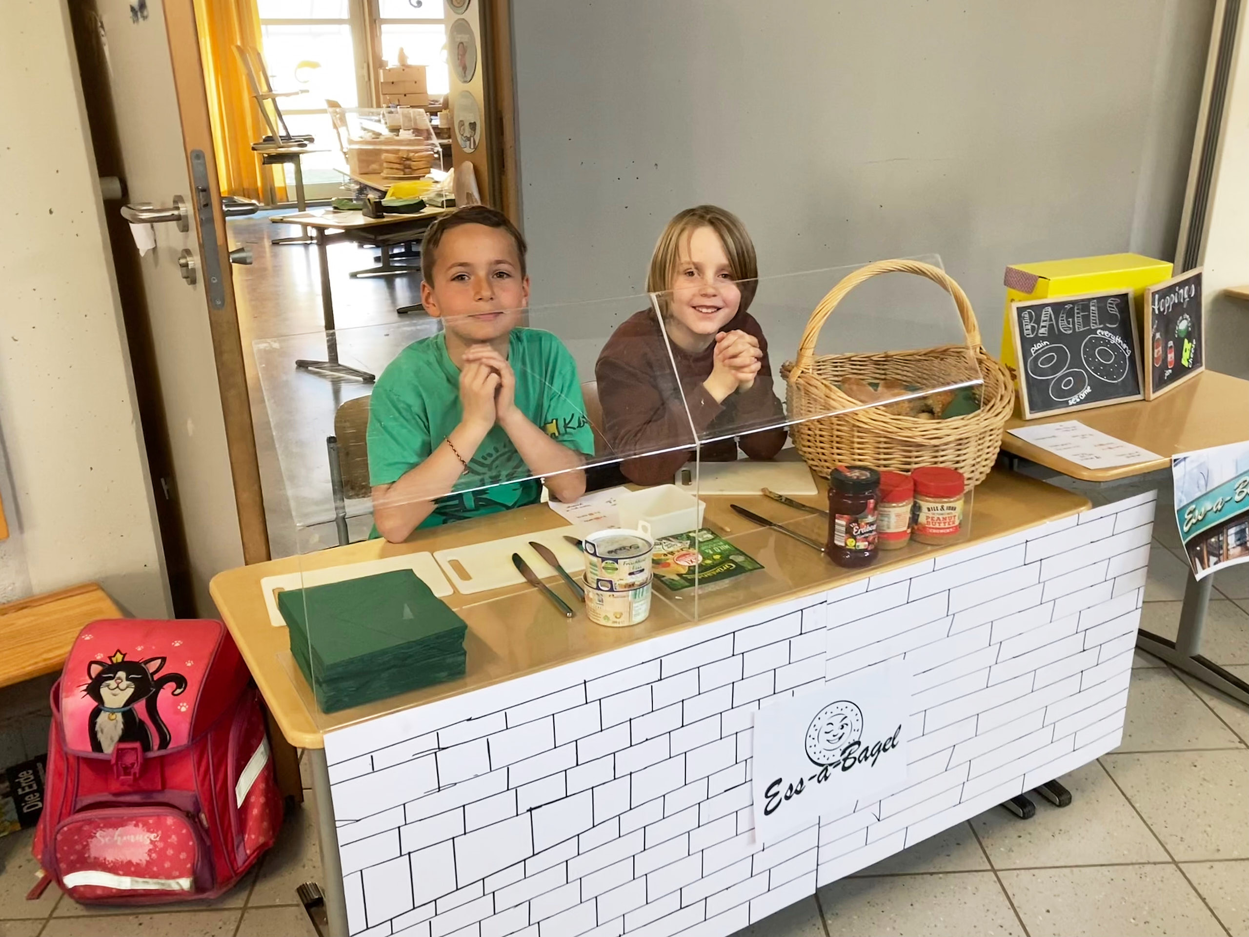 Zur Vorbereitung haben wir zuerst gelernt, wie man auf Englisch Essen bestellt und verkauft. Doch dann gingen die Vorbereitungen erst so richtig los! Die Kinder, die am freiwilligen bilingualen Sachunterricht teilnahmen, bauten berühmte New Yorker Läden als Essensstände nach. So entstanden tolle Stände, an denen die Kinder in zwei Schichten belegte Bagels, Cookies, Kuchen und Getränke verkaufen konnten.