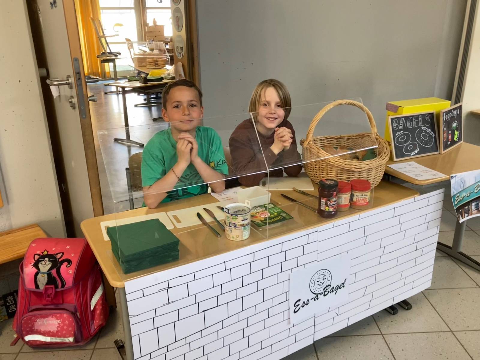 Zur Vorbereitung haben wir zuerst gelernt, wie man auf Englisch Essen bestellt und verkauft. Doch dann gingen die Vorbereitungen erst so richtig los! Die Kinder, die am freiwilligen bilingualen Sachunterricht teilnahmen, bauten berühmte New Yorker Läden als Essensstände nach. So entstanden tolle Stände, an denen die Kinder in zwei Schichten belegte Bagels, Cookies, Kuchen und Getränke verkaufen konnten.