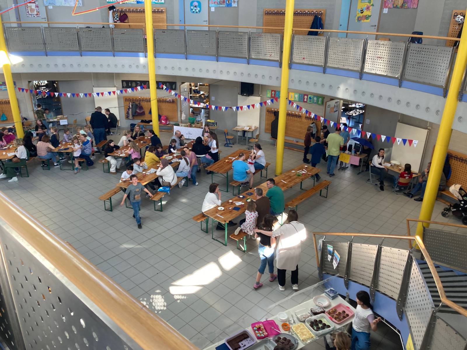 Unser English Café ist ein großes Fest für alle dritten und vierten Klassen und ihre Familien. Unsere Idee war, einen Ort zu schaffen, an dem alle Menschen mit Freude Englisch sprechen sollten. Man sollte auch englische Bücher lesen oder Spiele aus dem Englischunterricht spielen können. Am 04.04.2025 wurde die Idee des English Cafés von uns, der Klasse 4a der Grundschule Riedenberg, in die Wirklichkeit