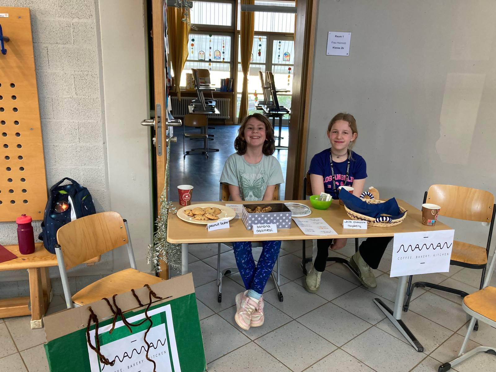 Wir bedanken uns bei der Ott-Göbel-Stiftung, durch die wir Obst und Wasser kostenlos und alle anderen Lebensmittel sehr günstig anbieten konnten. Am Tag davor haben wir nach englischen Rezepten Cookies gebacken. Es gab banana-oatmeal cookies, die waren vegan. Peanut butter cookies, chocolate chip cookies und white-chocolate-raspberry cookies gab es auch. Das Feedback an unserer Feedback-Station sprach für sich: Unser English Café war ein voller Erfolg!